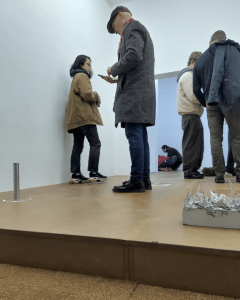Durch diese Verschiebung werden klassische Sehgewohnheiten des Galeriebesuches bewusst gebrochen: Der Fokus wandert von der Wand – traditionell privilegierter Ort der Präsentation – auf den Boden, jenes omnipräsente, doch oft übersehene Element des Raums. Dort werden Fragen von Flächenaufteilung, Nutzung, Materialität und Zugänglichkeit unmittelbar erfahrbar. Ohne namentliche Zuordnung tritt die gemeinsame Fläche in den Vordergrund.